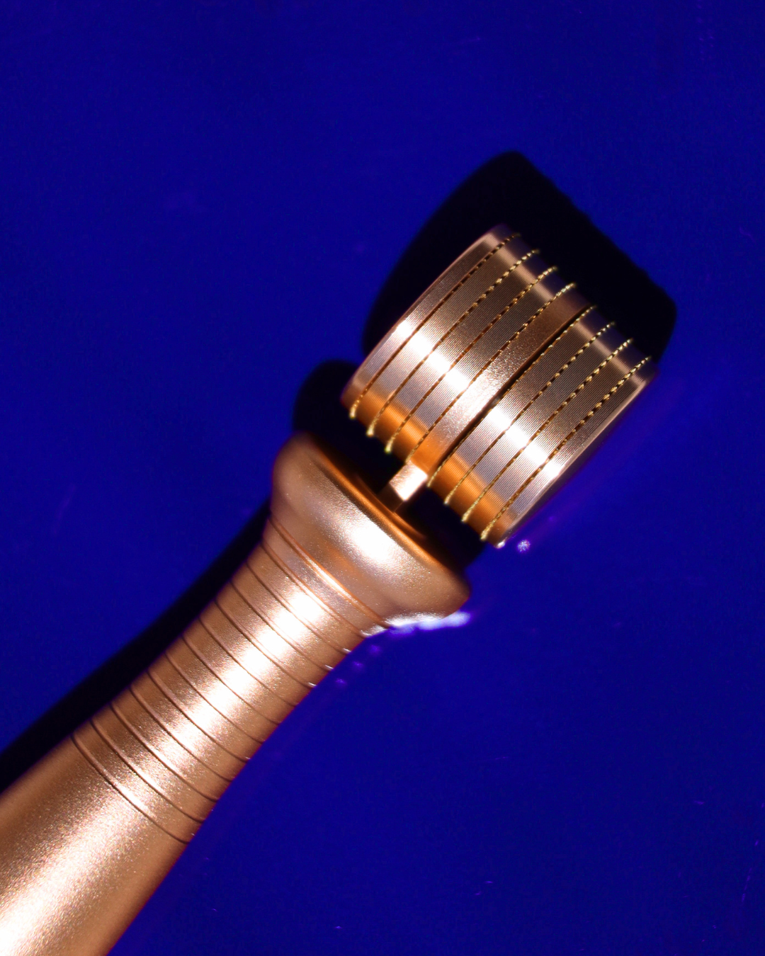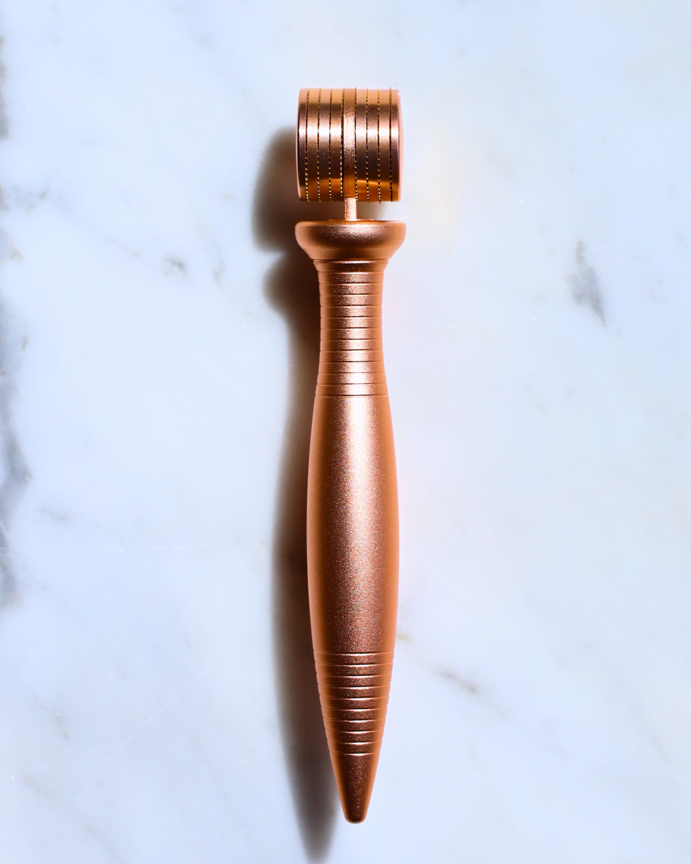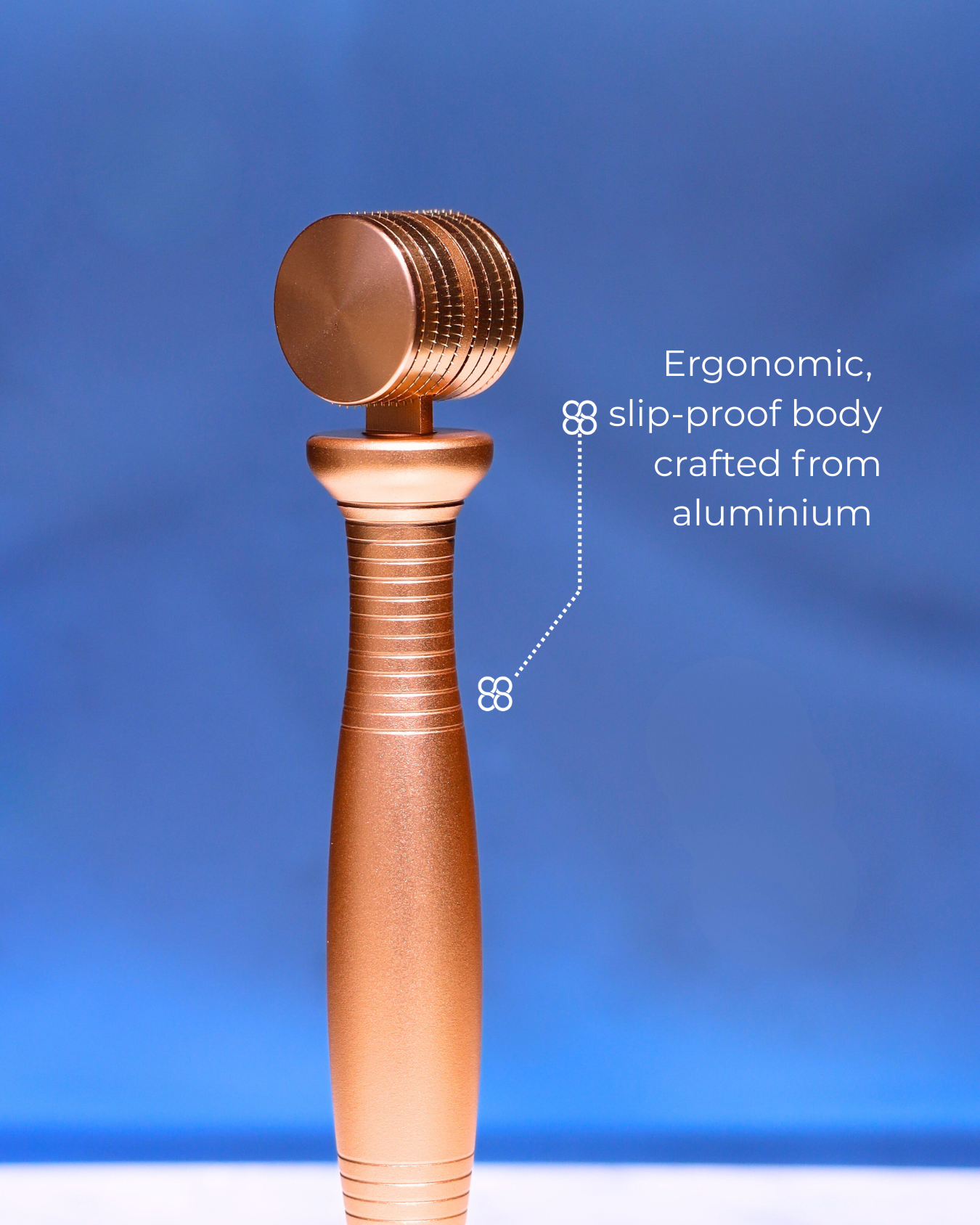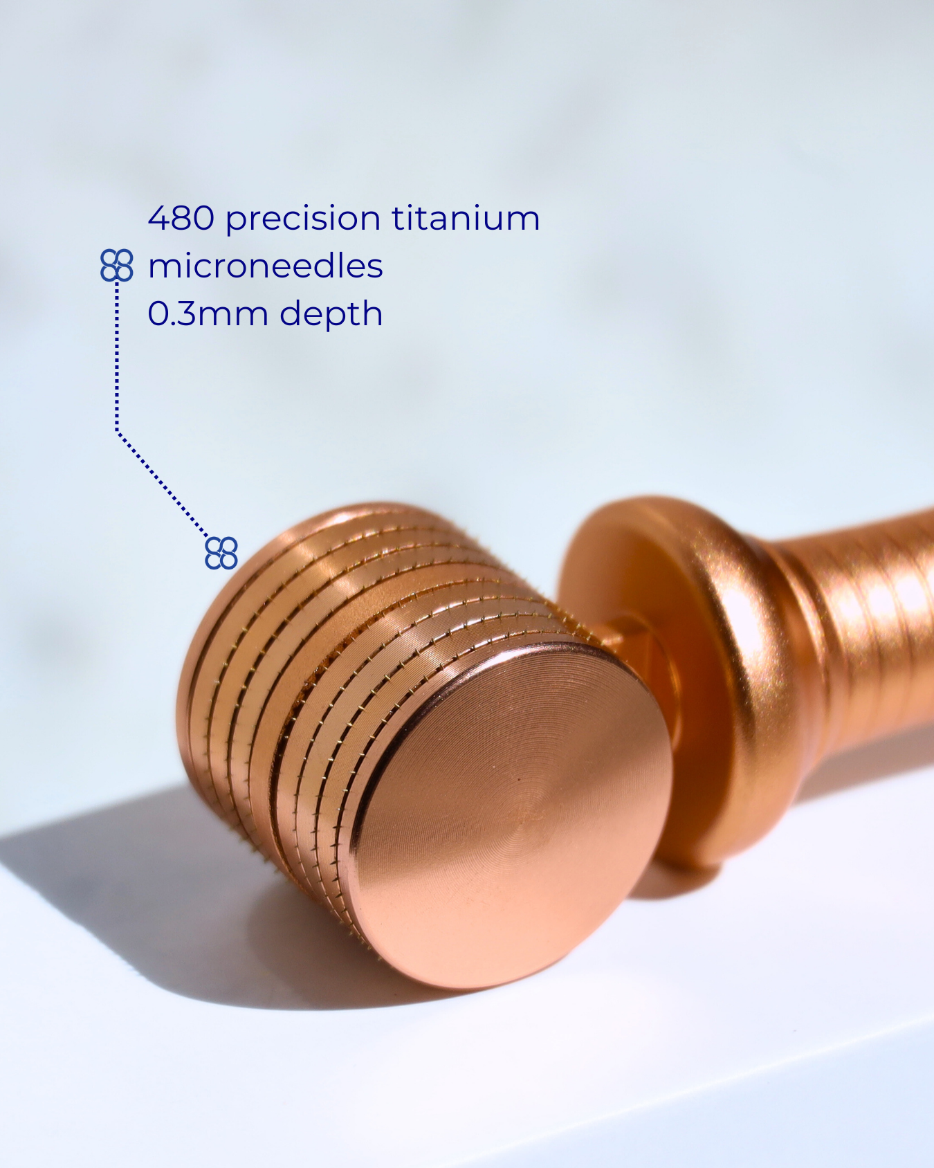 The roller’s 480 ultra-fine titanium needles create tiny, controlled microchannels in the superficial layers of the skin.